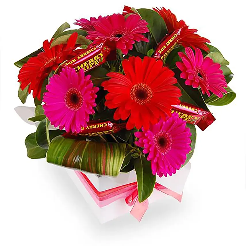 باقة ورد وشوكولاتة جربيرا منوعة وأوراق في فازة