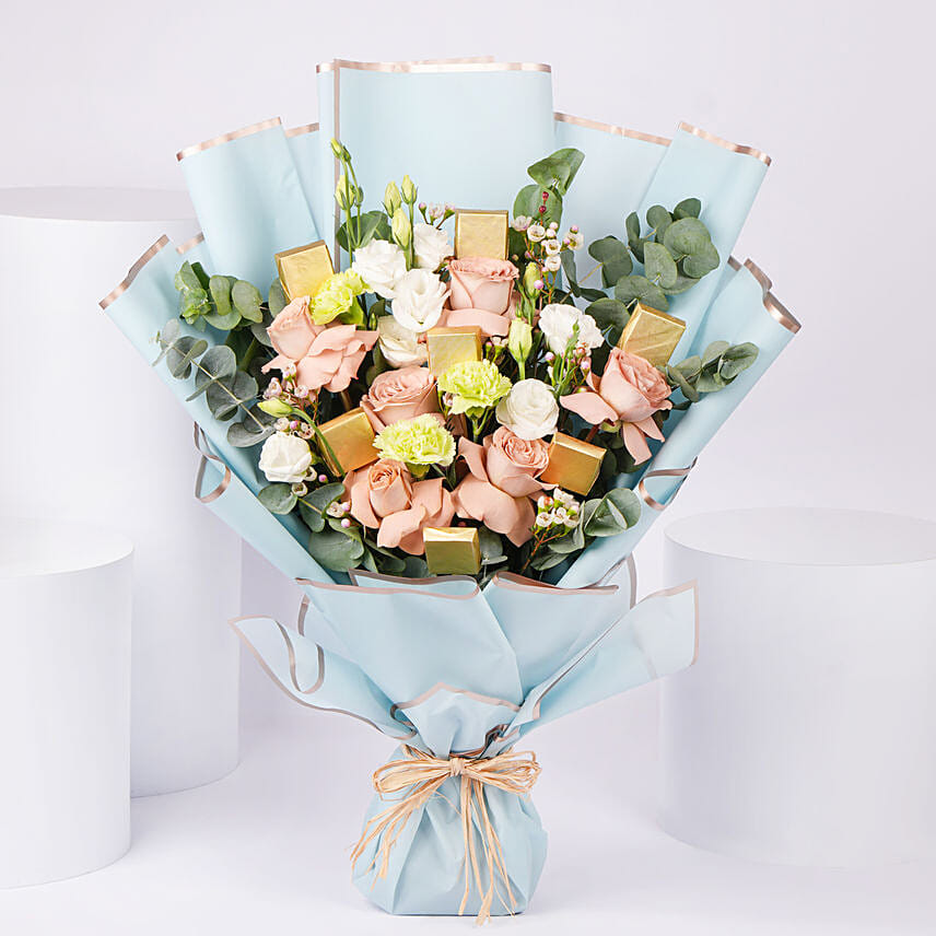 مع مزيج من الشوكولاتة اللذيذة وأجود الزهور، لا مجال للإخفاق! تنبعث من هذه الباقة الجمال والسحر، مما يخلق تنسيقًا رائعًا يترك انطباعًا يدوم. الشوكولاتة تضيف لمسة من الحلاوة.