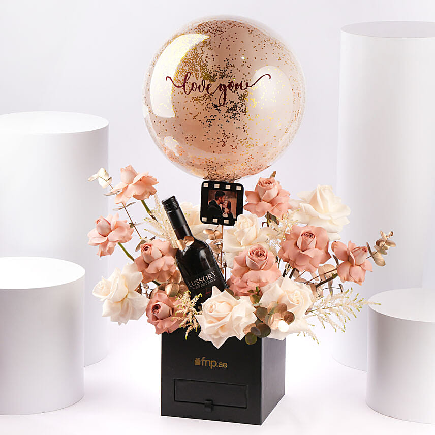• نوع المنتج: صندوق زهور مع بالون ونبيذ