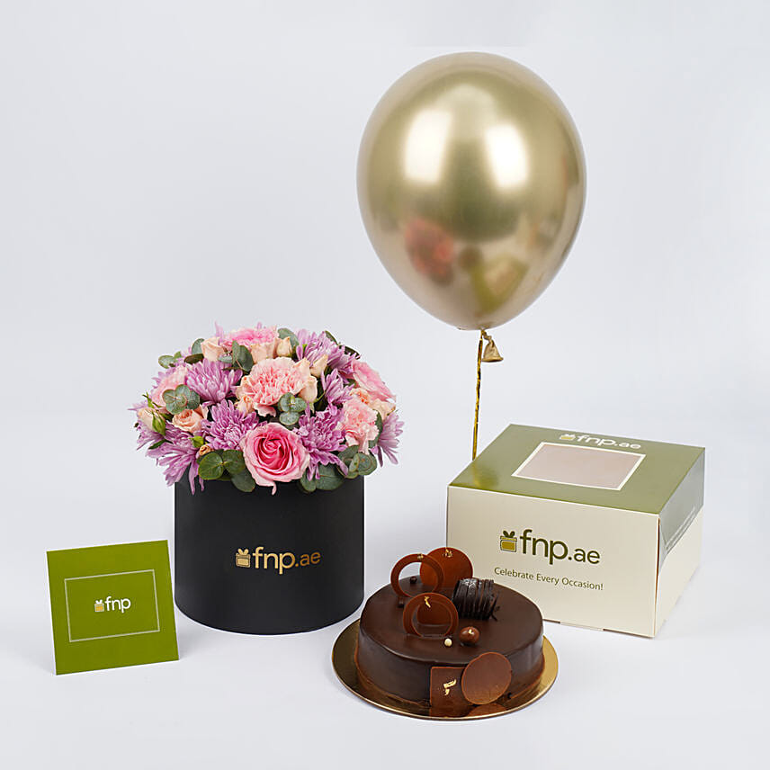 5 حشو قرنفل وردي فاتح، 2 أقحوان وردي فاتح يورو، 3 رذاذ خوخ روز سويت سارا، 1 حشو سينيريا أوكالبتوس، 3 وردي فاتح روز، نصف كيلو كيكة شوكولاتة فادج، 1 بالون مطاطية ذهبي لامع، 1 بوكس انيق دائري أسود