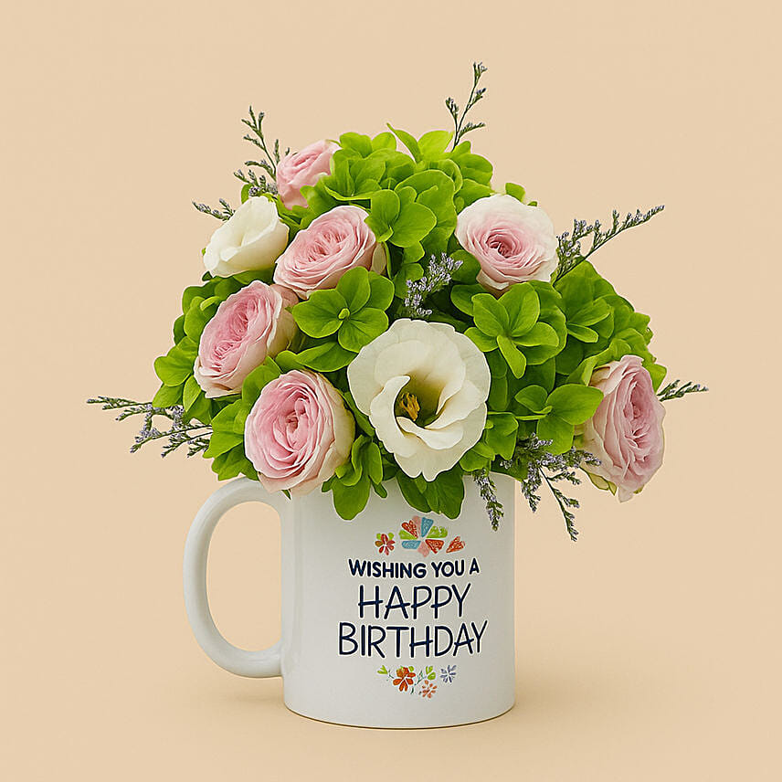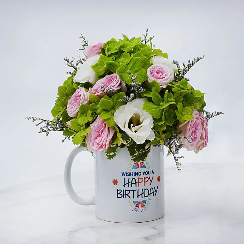 باقة الورود المبهجة ما تحتاجه لتسعد من تحب. أزهار منوع مرتبة بطريقة أنيقة في كوب عيد ميلاد لإضفاء البهجة على عيد ميلاد أحبائك وإضافة ذكريات جميلة. p>
