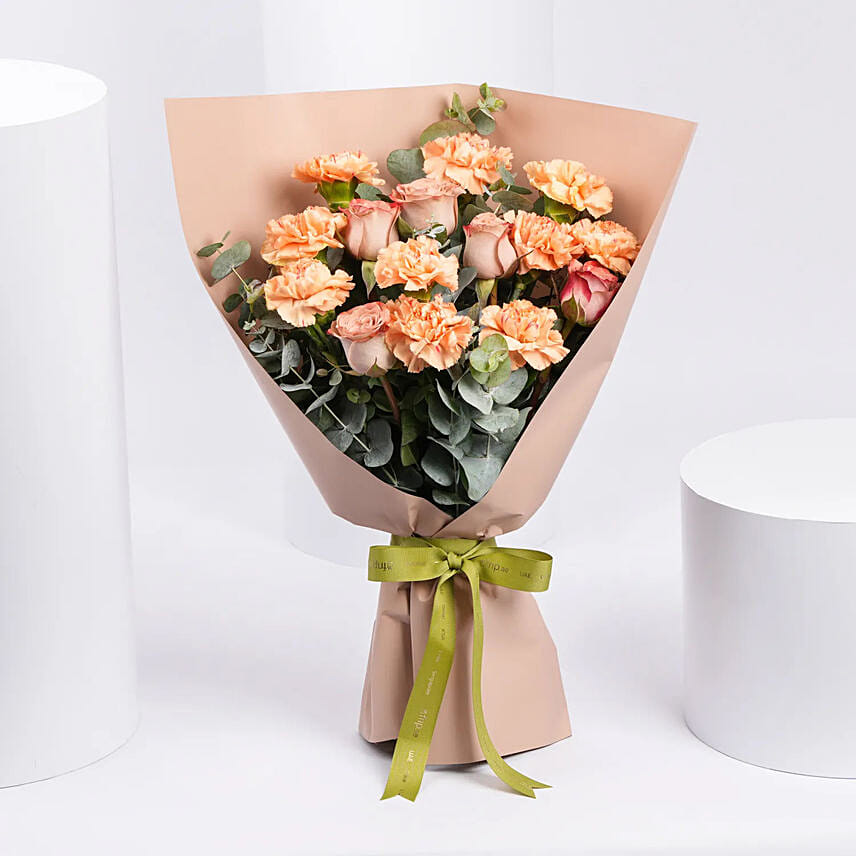 باقة ورد جوري وقرنفل برتقالي في غلاف بيج