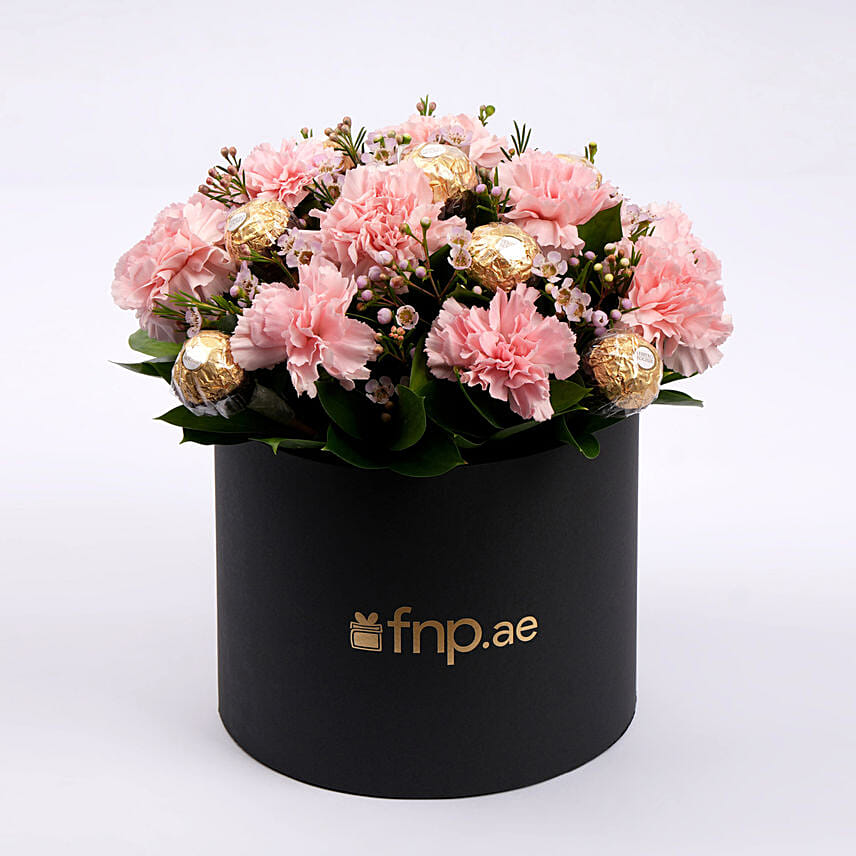 15 حشوة قرنفل وردي فاتح، 10 قطع مفردة من فيريرو روشيه، 2 حشو شمع وردي فاتح، 6 حشو روسكوس أخضر، 1 زهرة سوداء مستديرة المربع
