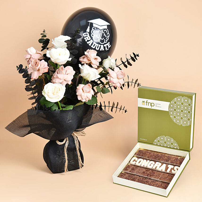 هدايا تخرج - باقة ورد في غلاف أسود مع بوكس شوكولاته