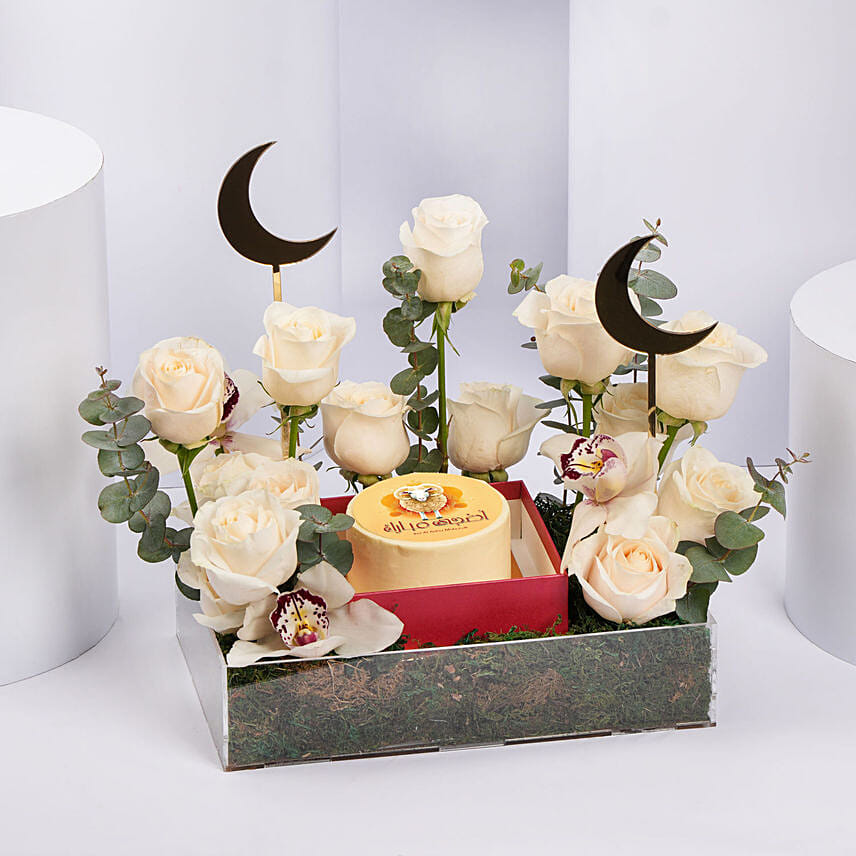 باقة ورد أبيض مع مونو كيك الشوكولاتة في بوكس أكريليك