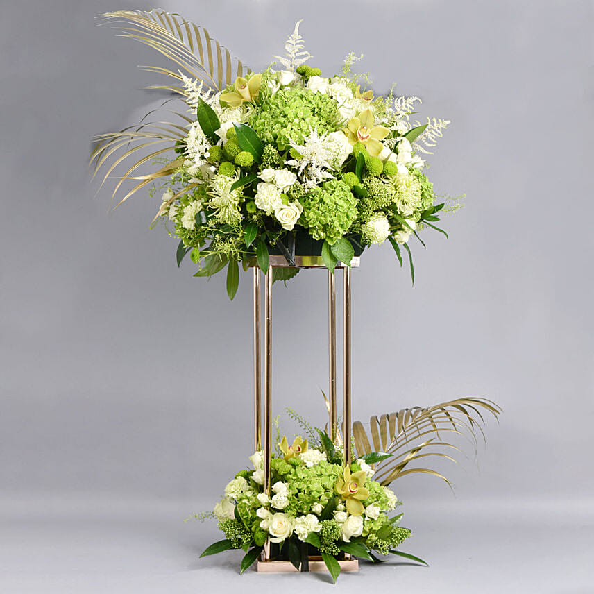 باقة ورود كوبية خضراء وجوري أبيض في ستاند ذهبي