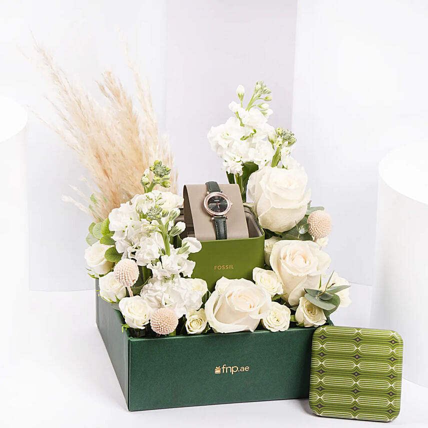 يجمع طقم الهدايا الرائع هذا بين الجمال الرقيق للأزهار الناعمة ورقي الساعات الكلاسيكية. مثالية للشخص الذي يقدّر الفخامة الرقيقة، فهي مصممة لالتقاط لحظات من الأناقة والصفاء، وهي مثالية للاحتفالات الخاصة أو ببساطة لإظهار تقديرك لشخص ما.