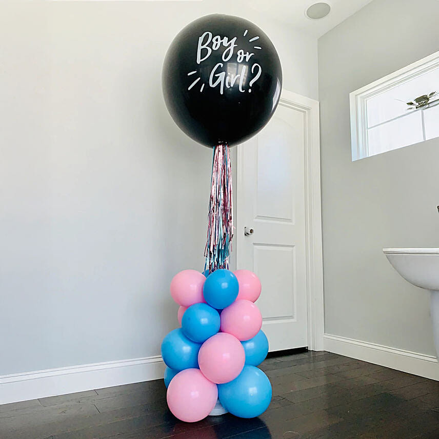 تم إعداد المشهد لاستقبال مولود جديد، وامتلأ الجو بالإثارة. في زاوية الغرفة، يعلو بالون أسود مدهش فوق عمود نابض بالحياة من البالونات الوردية والزرقاء، يمثل كل لون منها السؤال ”ولد“ أو ”بنت“.