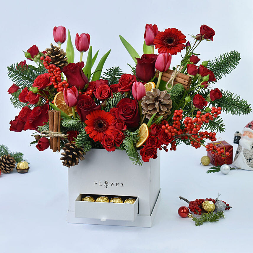 ورود حمراء ووردية في صندوق فاخر مع فيريرو روشيه للكريسماس