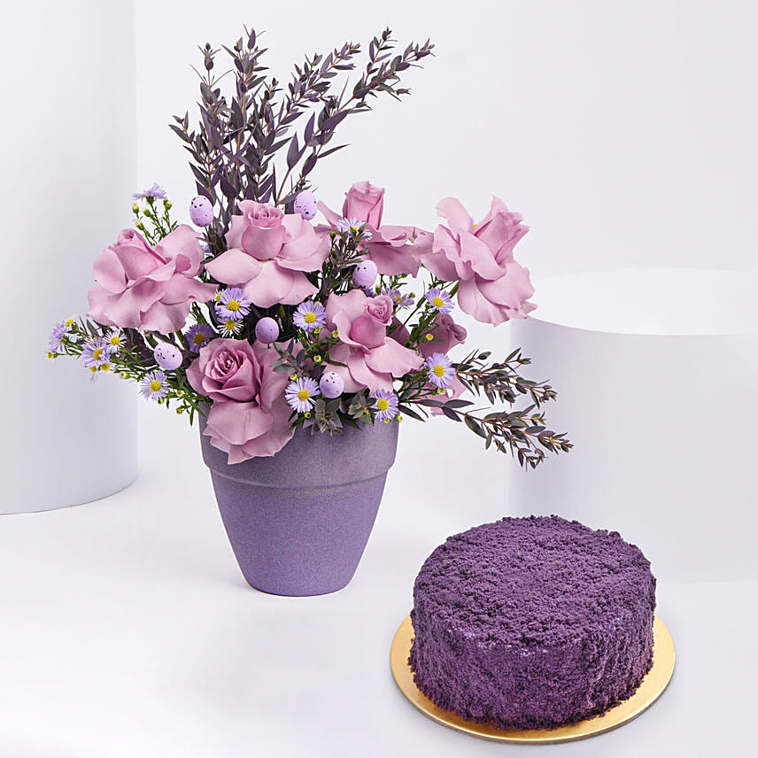 أوبي كيك مع باقة ورد جوري لون موف وليمونيوم في فازة