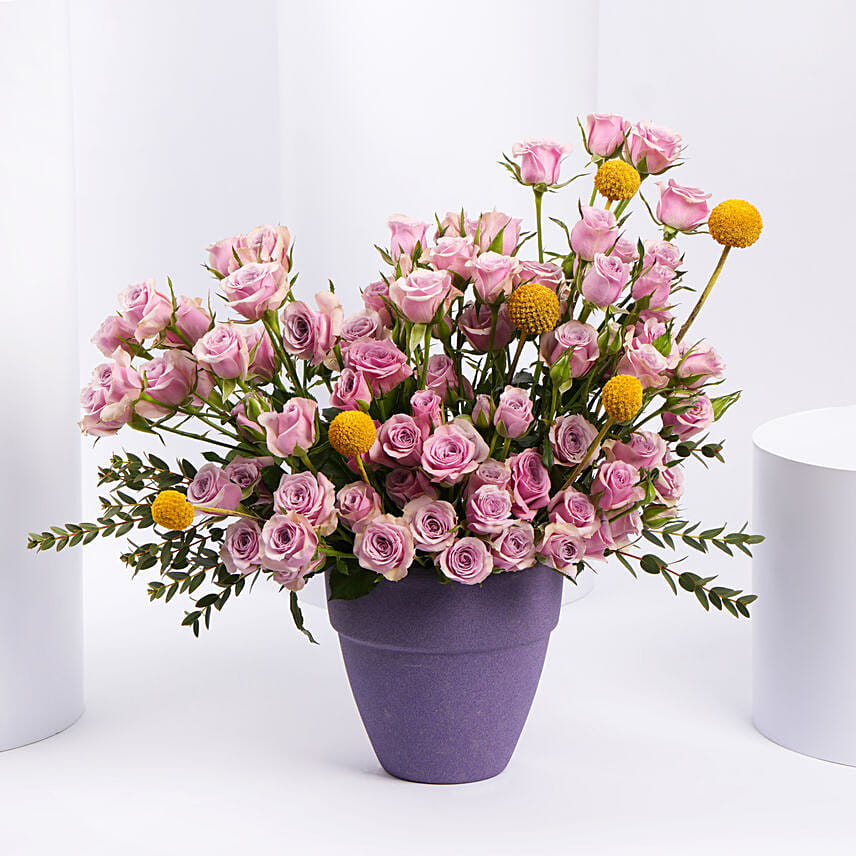 باقة ورد بيبي روز لون موف مع كراسبيديا صفراء في فازة