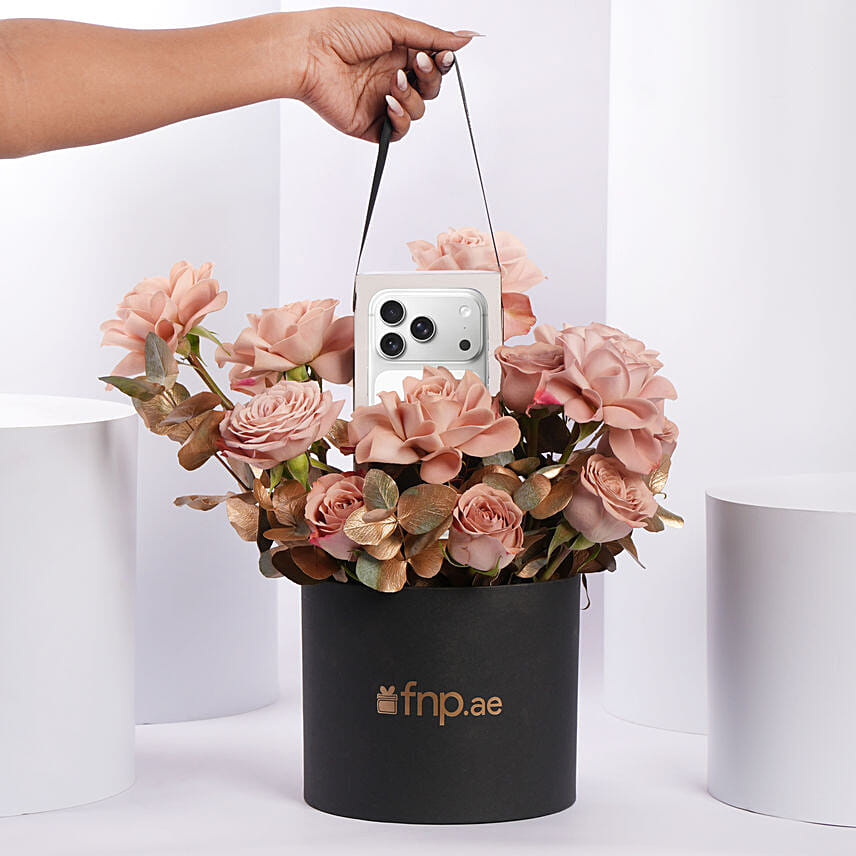 آيفون 17 برو ماكس باللون الفضي بسعة تخزين 512 جيجابايت، شاشة سوبر ريتنا XDR مقاس 6.9 بوصة مع تحسين السطوع ومقاومة الانعكاس ودعم ProMotion حتى 120 هرتز، مع حماية درع سيراميك متقدمة والكاميرا الخلفية بدقة 48MP والكاميرا الأمامية بدقة 18MP مع Center Stage، ويأتي مع 12 وردة كابتشينو مرتبة في صندوق أسود دائري.