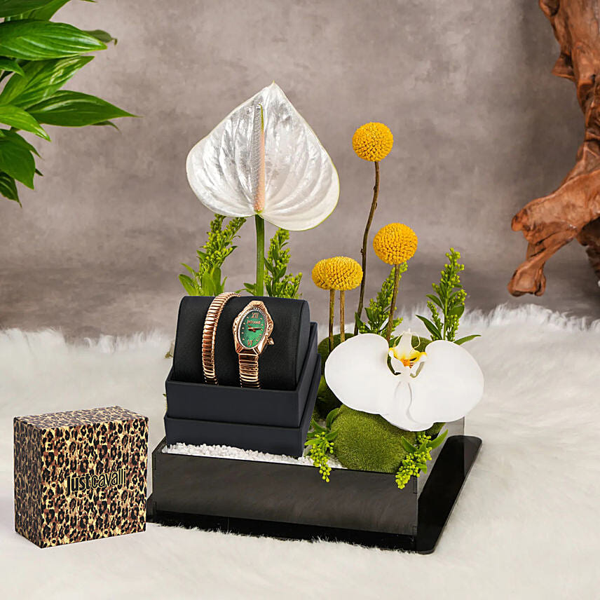 "This contemporary floral gift box pairs high-style design with a standout timepiece from Just Cavalli, known for its bold snake-inspired look and coiled bracelet. Watch features a coiling gold-tone stainless steel bracelet with a striking green oval dial, encircled by a fine line of crystal accents. The sculpted snake-like shape makes it a head-turning accessory that blends statement fashion with everyday wearability. Perfect for anyone who appreciates creative presentation and distinctive style, this gift box is ideal for birthdays, achievements, or any occasion where you want your gift to stand out. It’s both a visual treat and a practical keepsake that speaks to personality and flair."