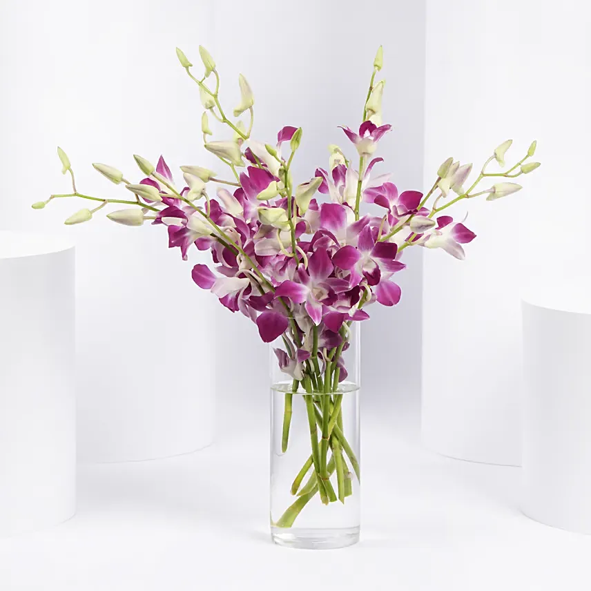 9 ورود اوركيد ارجوانية ، مرتبة بشكل جميل في مزهرية مستديرة