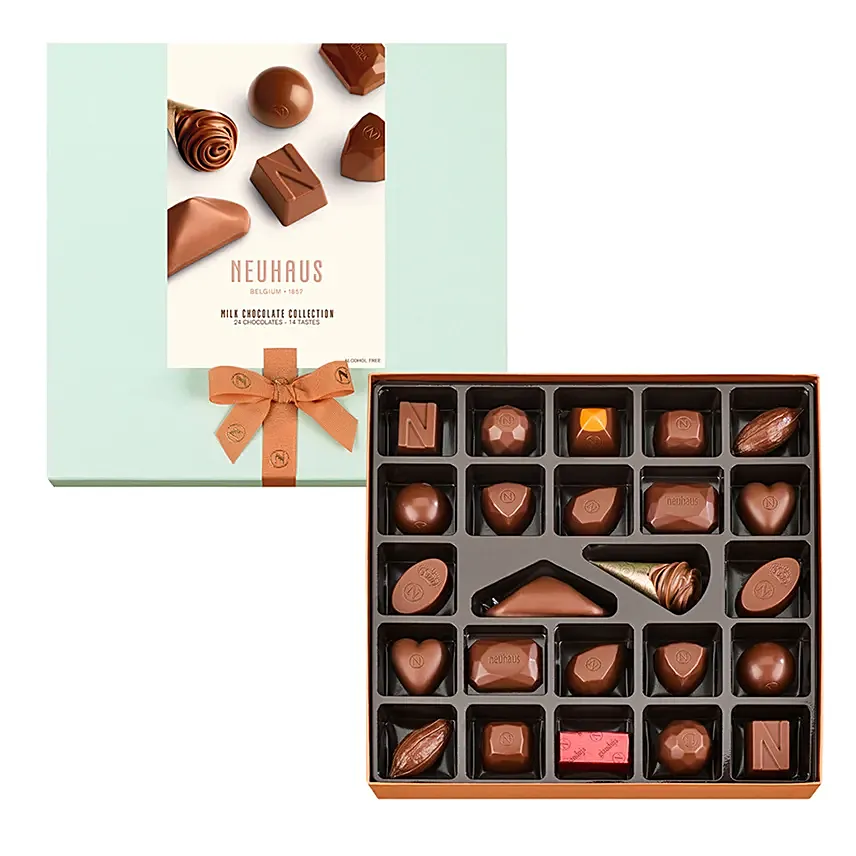 اكتشف مجموعة شوكولاتة نيوهاوس بالحليب في علبة أنيقة تحتوي على 24 قطعة. علبة هدايا معاصرة وأنيقة بحشوات الكراميل والغاناش والكراميل.