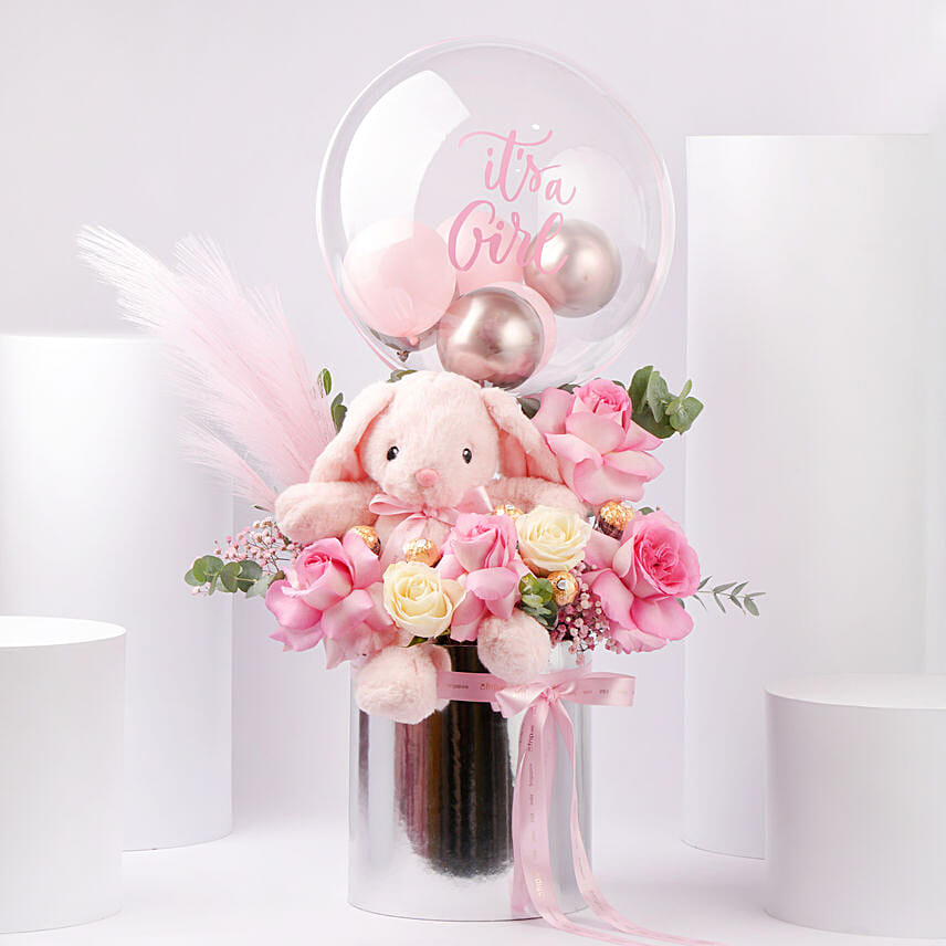 استقبلوا الأميرة الصغيرة مع هذه الهدية الساحرة التي تضم دبدوب أرنب وردي ناعم محاط بورود طبيعية باللونين الوردي والأصفر، مزينة بشوكولاتة فيريرو روشيه الشهية. يعلو التنسيق بالون شفاف مكتوب عليه "It’s a Girl" مع بالونات صغيرة بألوان الباستيل، ليكون الهدية المثالية للاحتفال بالمولودة الجديدة وإضافة لمسة من الفرح لمناسباتكم.