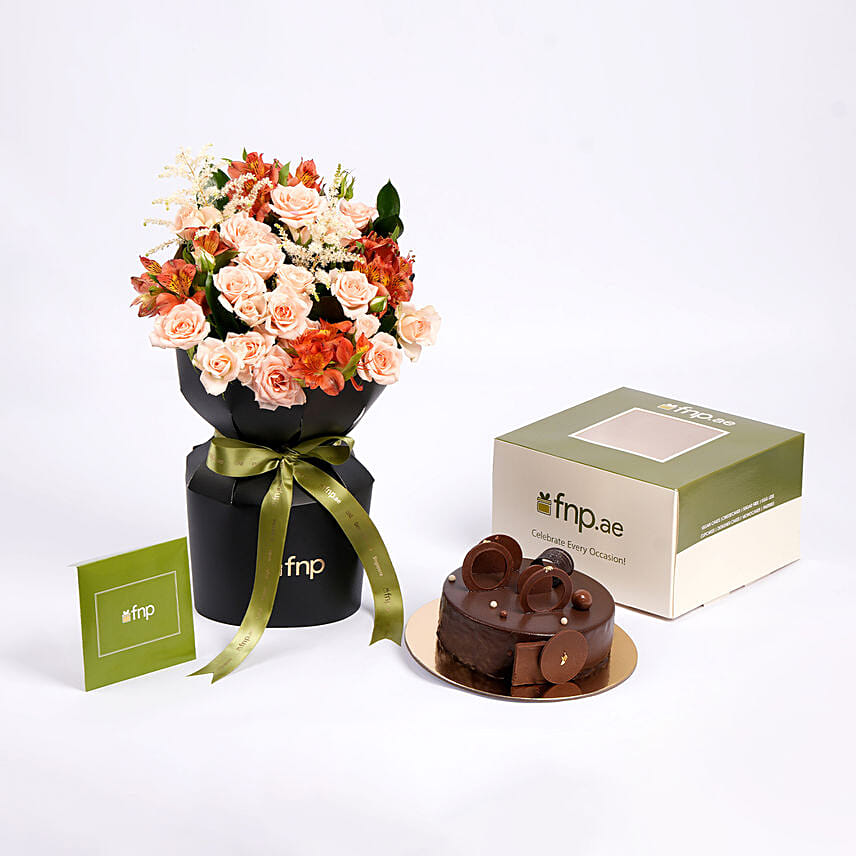 باقة ورد بديعة مع كيك شوكولاتة