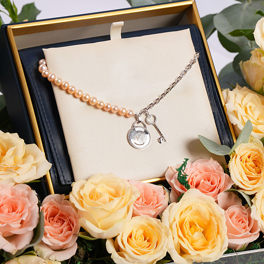 تكتمل هذه الهدية المميزة بباقة زهور أنيقة تضم ورود الرذاذ الخوخية، ورود سويت سارة الخوخية، وحشوات من زهور الكينا الرمادية، تم تنسيقها في صينية خشبية مستديرة لخلق توازن مثالي بين الفخامة والجمال الطبيعي.