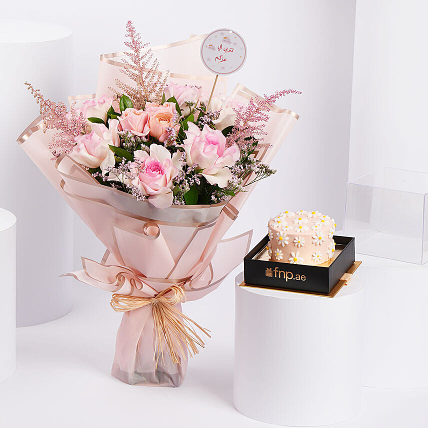 عندما تبحث عن هدية تحمل الرقة في تفاصيلها وتعبّر عن مشاعر صادقة دون مبالغة، تأتي أناقة وردية مع كيك الشوكولاتة لتكون الخيار المثالي. تنسيق أنيق يجمع بين جمال الورود الوردية الناعمة وحلاوة كيك الشوكولاتة الغني، ليحوّل لحظاتك الخاصة إلى ذكريات لا تُنسى.