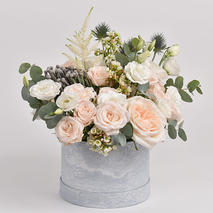 باقة ورد لون مشمشي مع أوكاليبتوس في بوكس رمادي