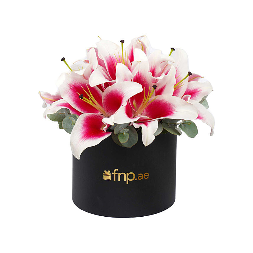 3 زهرة الزنبق الوردي الشرقية، 1 حشوة سينيريا أوكالبتوس، 1 بوكس أسود