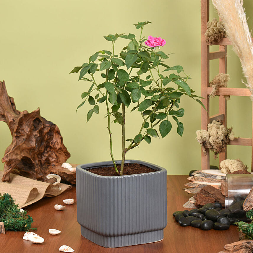 نبات ورد جوري أخضر في أصيص رمادي فاخر
