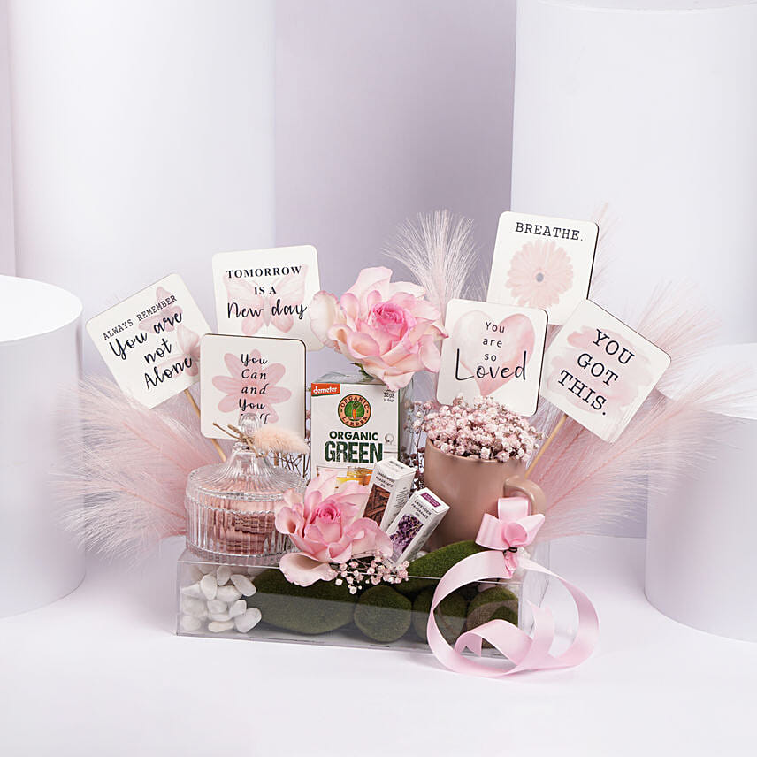 سلة هدايا مصممة بعناية فائقة وموضوعة في صندوق أكريليك شفاف مع باقة ورد. تحمل رسالة من الإيجابية والتشجيع والاسترخاء يتم نقلها من خلال عناصر متنوعة ومحفزة.