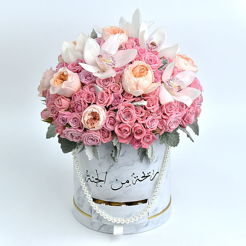 باقة ورد بيبي روزو وردي وأوركيد أبيض في بوكس