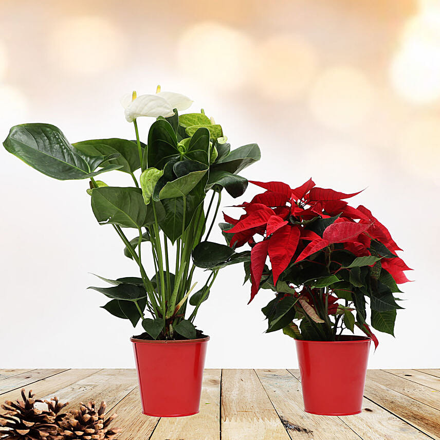 • 1 Red Ponsettia Plant In A Red Metal Pot