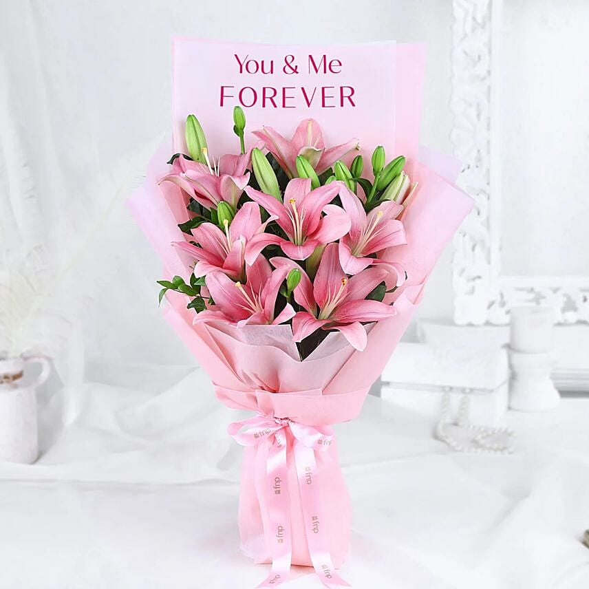 In a world of blossoms, the pink Asiatic lily stands as a symbol of love and devotion. This Karwa Chauth, gift a beautiful bouquet wrapped in a heartfelt sheet that proclaims You Me Forever Perfect for your beloved wife, this enchanting arrangement expresses your everlasting bond. With each delicate petal, let her feel the warmth of your affection, turning this special day into a cherished memory of romance and togetherness!
