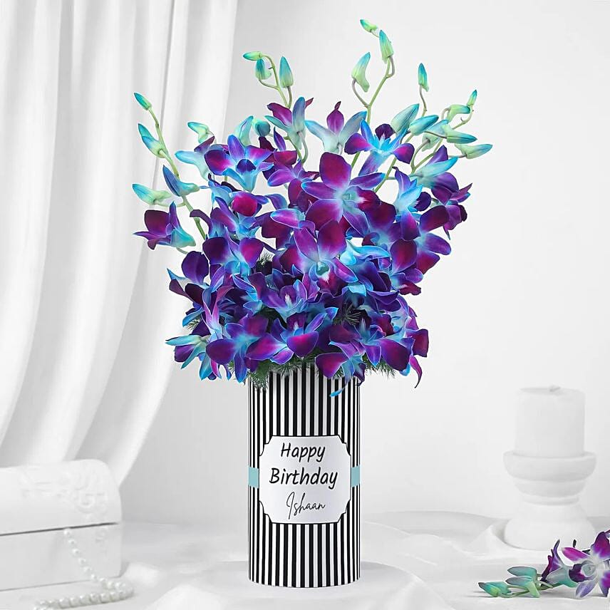 Celebrate their special day with a touch of elegance. This captivating arrangement of vivid blue orchids paired with fresh green asparagus fillers is beautifully presented in a sleek glass vase. Radiating charm and sophistication the serene blue tones make it a stunning birthday surprise. Whether its for a loved one friend or colleague this floral gift brings beauty warmth and a sense of occasion. Its more than a bouquet its a graceful gesture that turns their birthday into a truly memorable moment.