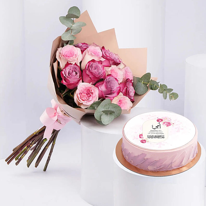 6 Purple and 6 Pink Roses Bouquet With Chocolate Cake