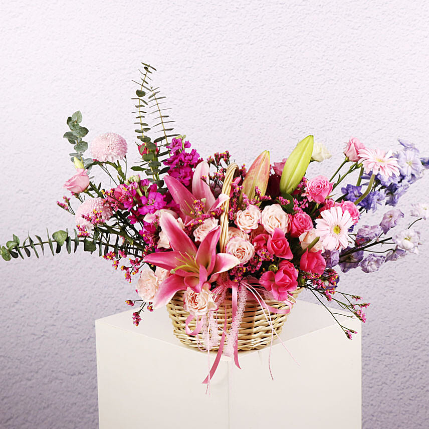 باقة ورود مشكلة مع زنبق وردي في سلة