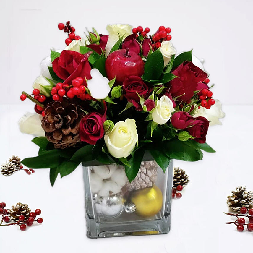 هدية كريسماس باقة ورد أحمر في فازة مع كرات ذهبية