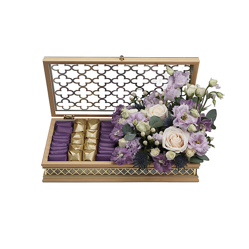 باقة ورود مشكلة في علبة زجاجية مع شوكولاته فاخرة