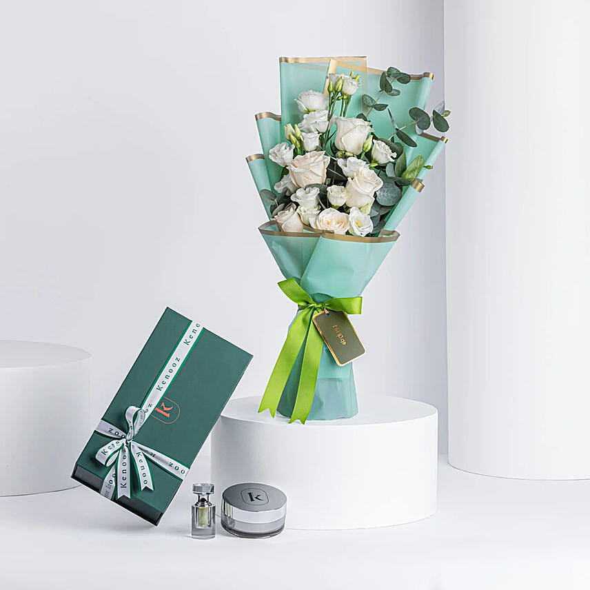 Indulge in the exquisite charm of the Kenooz Gift Set, featuring a stunning bouquet of fresh white roses and eustoma, elegantly wrapped in green with a matching ribbon. This beautiful arrangement is complemented by aromatic eucalyptus, creating a serene and refreshing floral display.