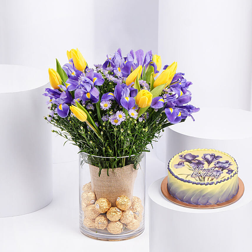 كيك شوكولاتة مع باقة ورد سوسن لون موف وتوليب أصفر