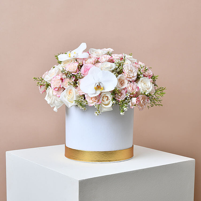 باقة ورود بيبي روز وردي وأبيض في بوكس أنيق