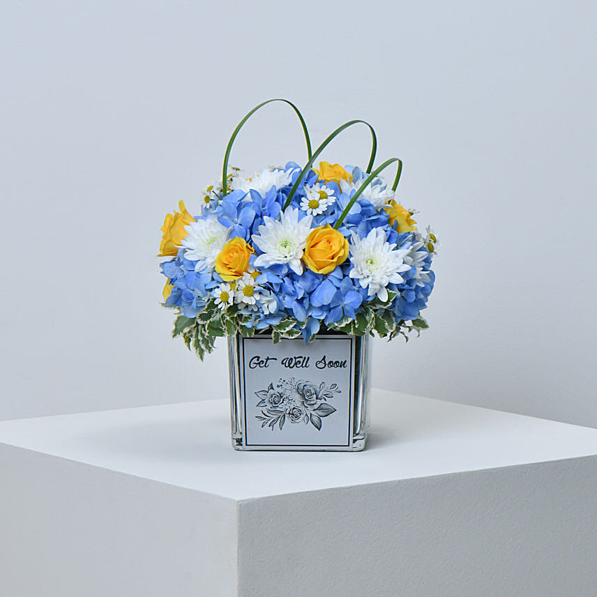 باقة ورود كوبية أزرق وأصفر وأبيض في فازة مخصصة