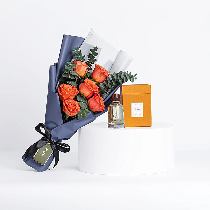 Experience the exquisite blend of scents with the Kenooz Dessert Rose 100ml perfume, perfectly paired with a stunning floral bouquet. This unisex fragrance captures the essence of elegance and charm, making it an ideal gift for any occasion.