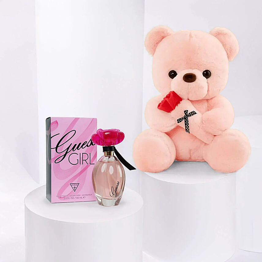 Delight in the perfect gift set featuring a charming Pink Teddy Bear and the exquisite Guess Girl Eau de Toilette 100ml. This duo makes a thoughtful present for any occasion, combining the softness of a plush toy with the elegance of a floral fragrance.