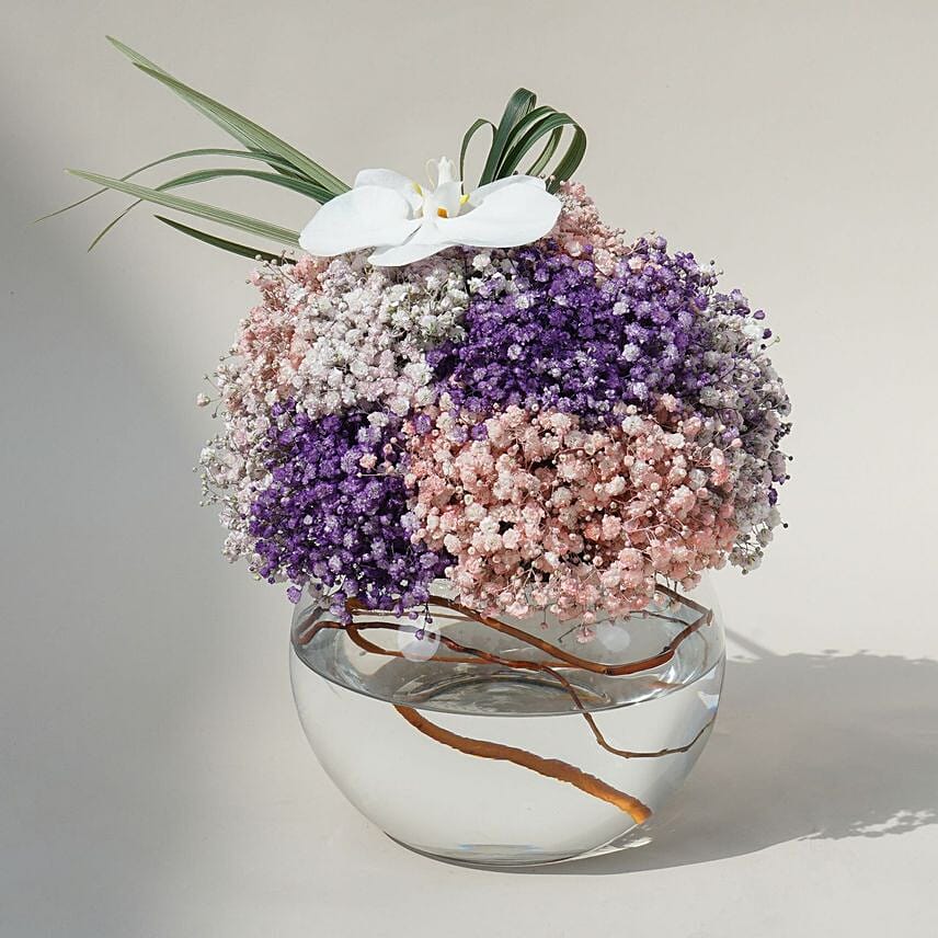 باقة ورد جيبسوفيليا موف ووردي مع أوركيد في فازة