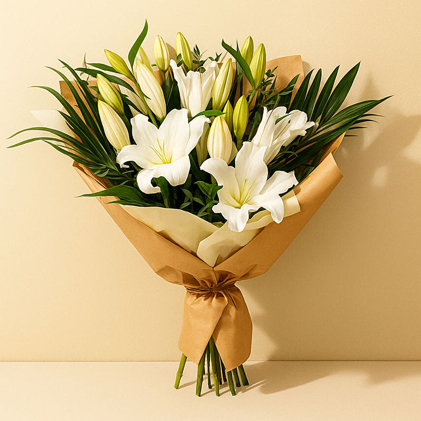 باقة ورود زنبق أبيض وأوراق خضراء في غلاف ورقي أنيق