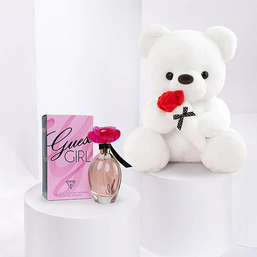 Delight your senses and express your affection with this charming gift set, featuring a cuddly white teddy bear and the alluring Guess Girl Eau de Toilette 100ml.