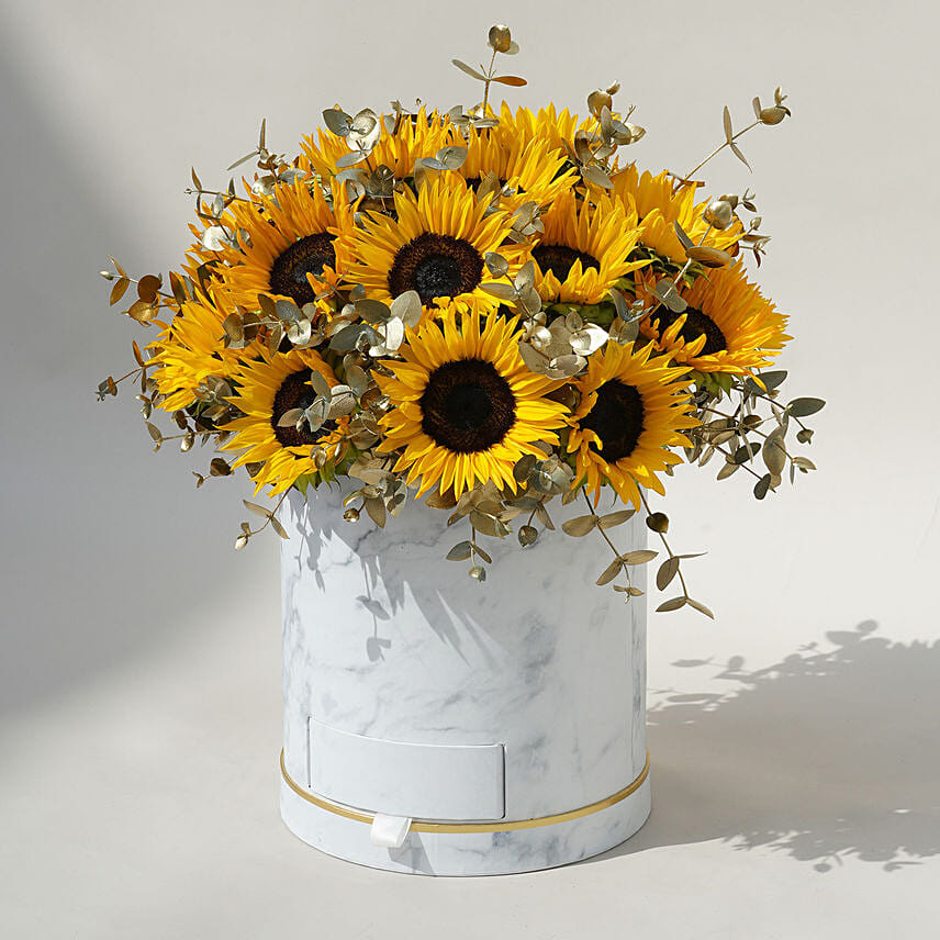 • اجعل يوم شخص ما أكثر إشراقًا من خلال هذا الترتيب المبهج. عباد الشمس المبهج هو الطريقة المثلى لإظهار الولاء والإعجاب ، كما توحي لغة الزهور. صندوق الزهور الساحر هذا سينشر السعادة ويحسن مزاج أحبائك على الفور.