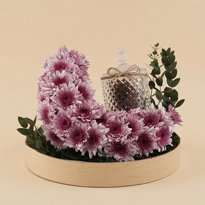 تنسيق رمضاني أنيق مستوحى من شكل الهلال، يجمع بين جمال زهور الاقحوان البنفسجية ولمسة الضيافة العربية الأصيلة مع التمر الفاخر. تصميم فني مميز داخل بوكس دائري يعكس روح الشهر الكريم، ليكون خياراً مثالياً لهدايا رمضان الراقية أو لتزيين موائد الإفطار بأسلوب يجمع بين الطبيعة والأصالة.