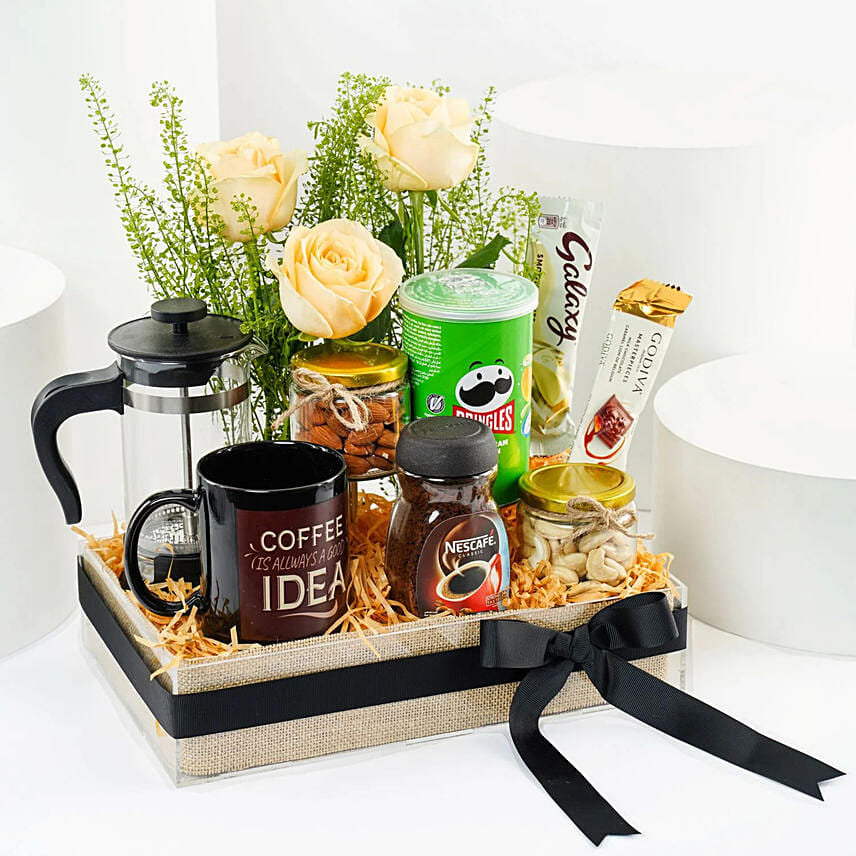 Gift basket in an acrylic tray 30*20*7 cm with a black ribbon containing:
