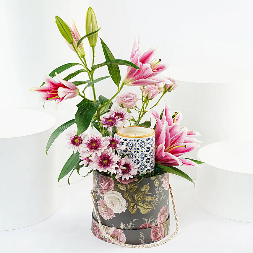 Elevate any space with the Graceful Blooms n Candle Flower Box, a charming blend of elegant pink lilies and dual-tone chrysanthemums thoughtfully arranged in a beautifully printed floral box. Accompanied by a premium scented jar candle with a lid, this exquisite gift brings warmth, beauty, and a touch of luxury to any occasion. This gift is perfect for any occasion and is perfect for birthdays, celebrations, or simply adding a graceful touch to a loved one’s day.