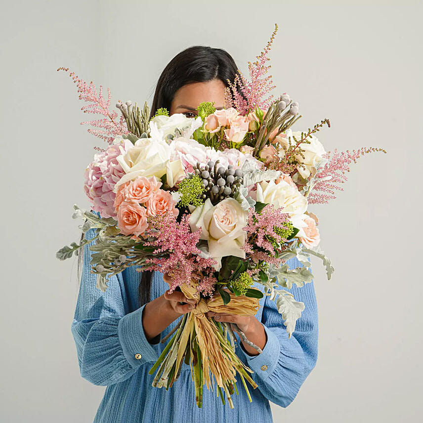 باقة فاخرة من ورود الباستيل ، وطاحونة الأسطبلية والمغبرة ، مقترنة بلمسة من الفضة البرونزية المتلألئة. باقة مهدئة مثالية لإرسال التمنيات الطيبة أو الاحتفال بأي مناسبة.