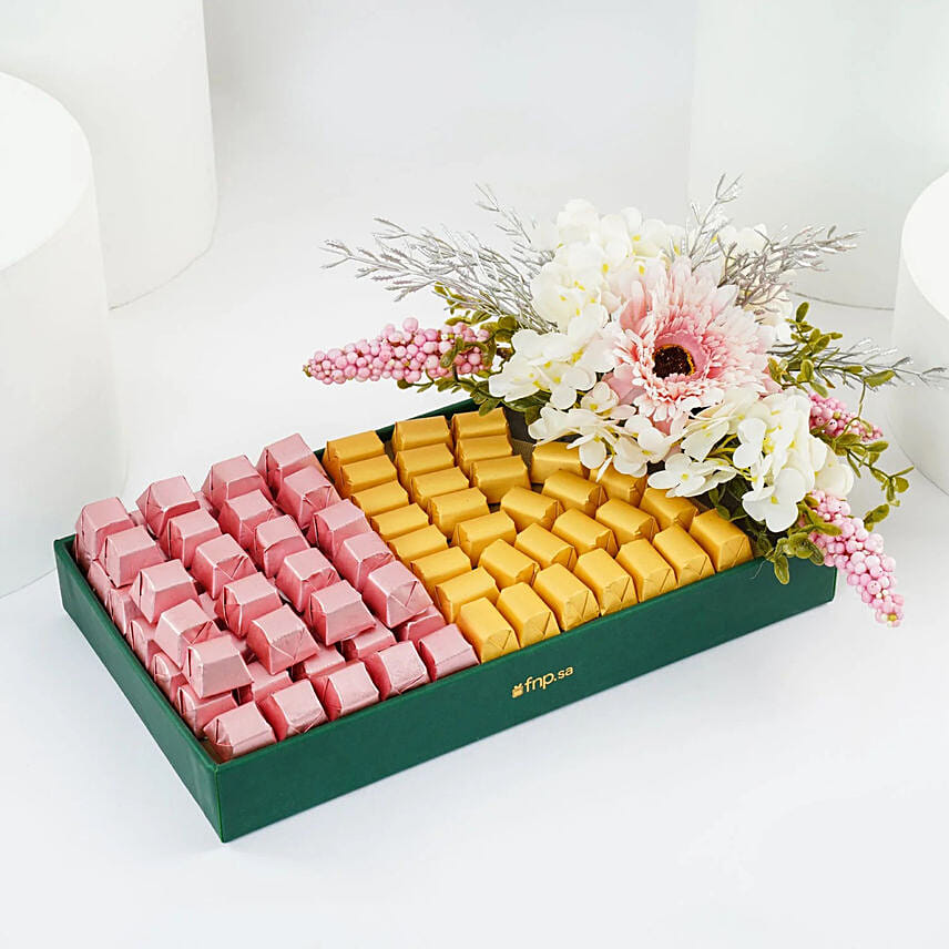 Make every occasion unforgettable with a tray of flowers and chocolates | Pink and gold. Features a wonderful arrangement of artificial rose bouquet Mixed with pieces of luxury chocolate, presented in an elegant leather tray, making it ideal for gifts and special occasions such as birthday, wedding anniversary, baby shower, or patient visitation gifts.